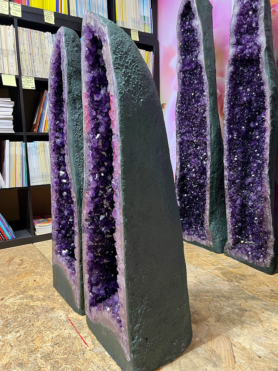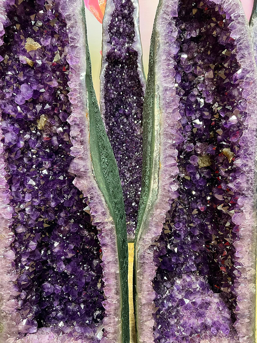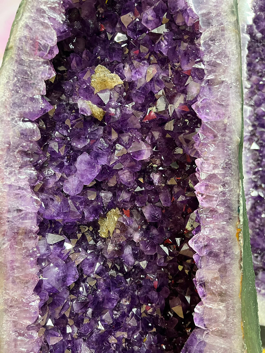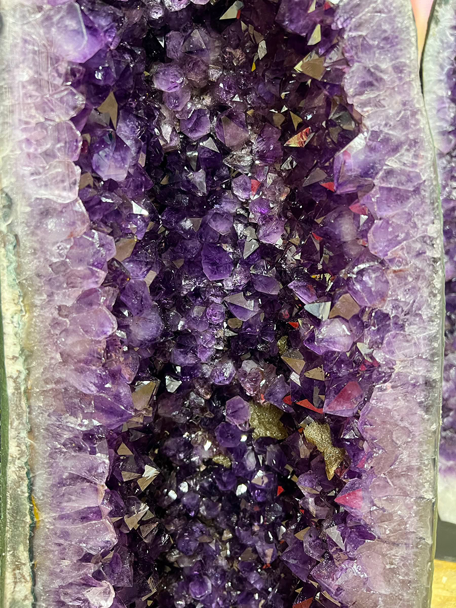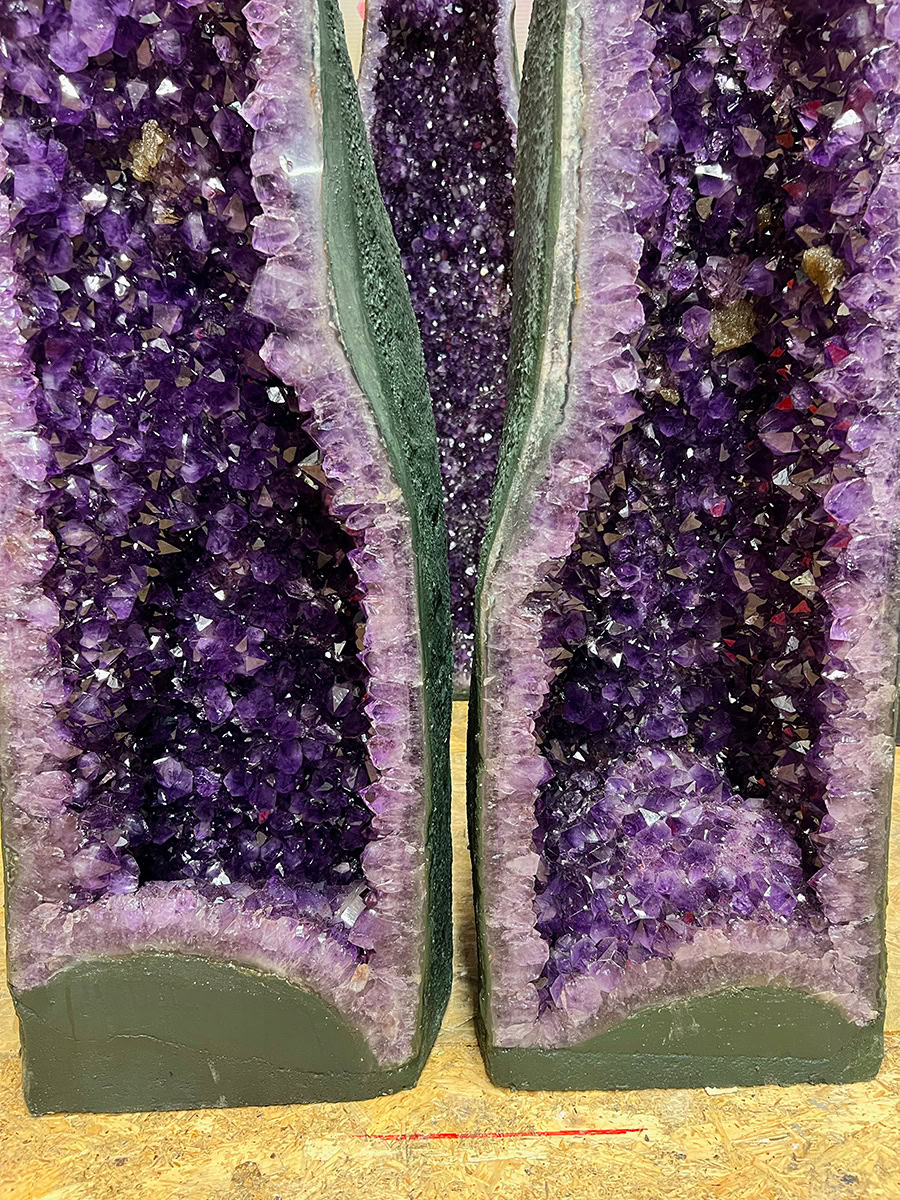 Twee geodes die bij elkaar horen met prachtig gevormde kristallen en mooi diep paars van kleur.