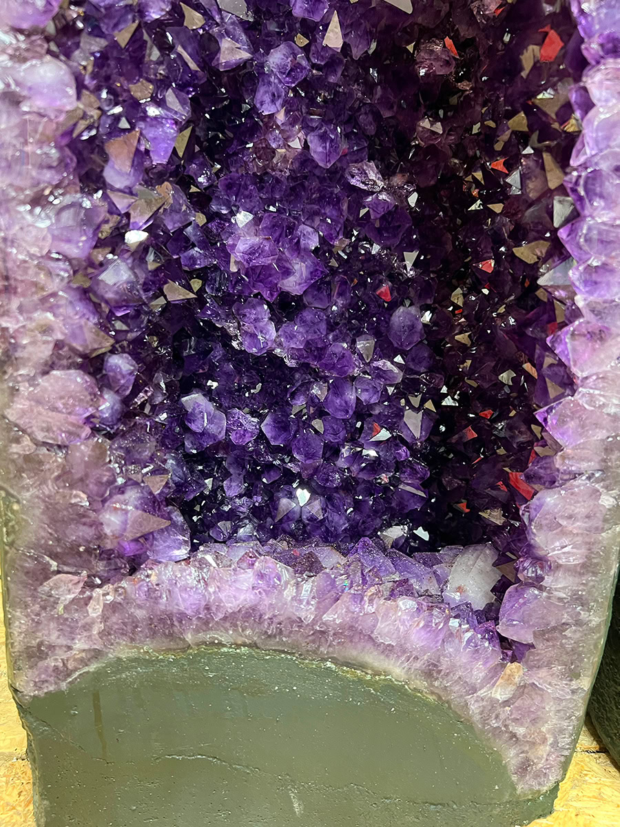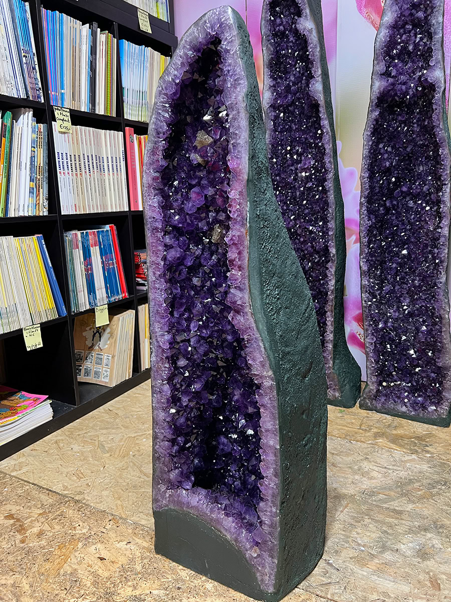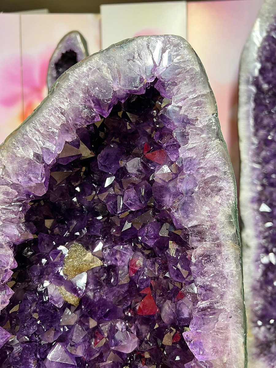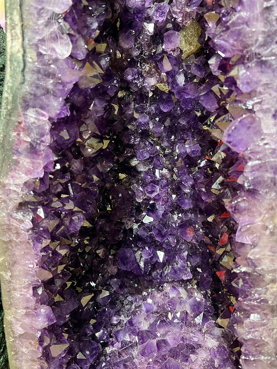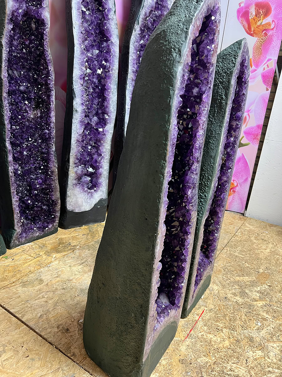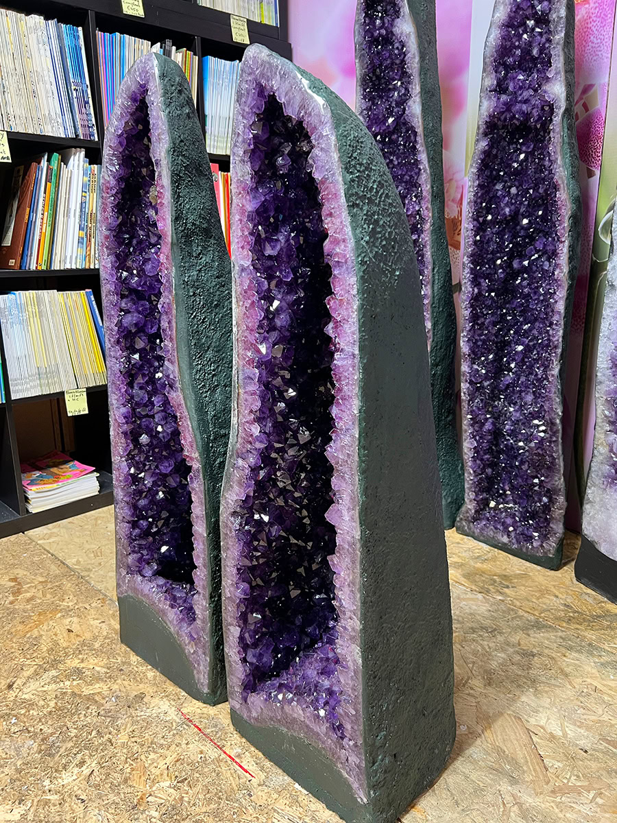 Twee geodes die bij elkaar horen met prachtig gevormde kristallen en mooi diep paars van kleur.