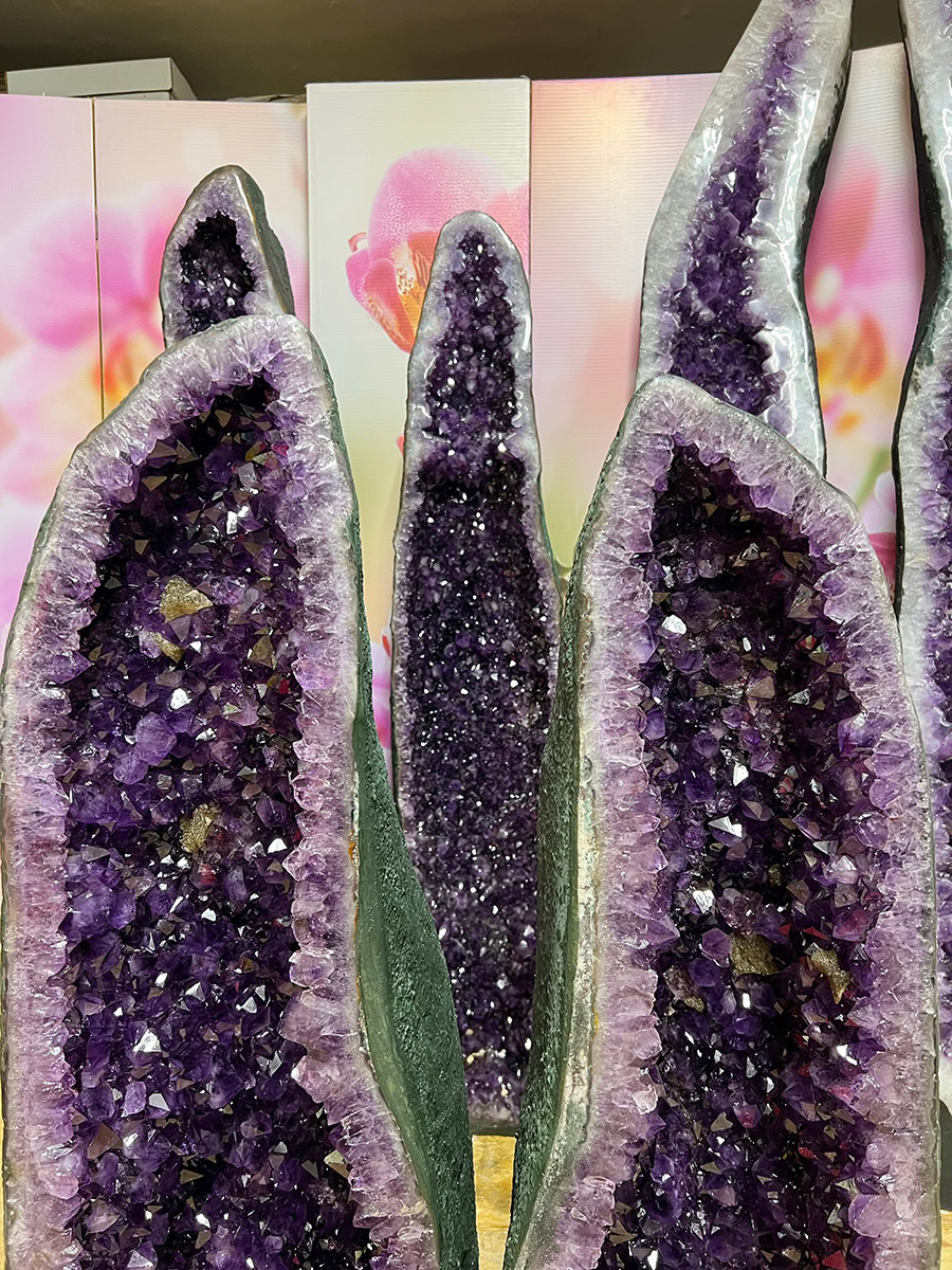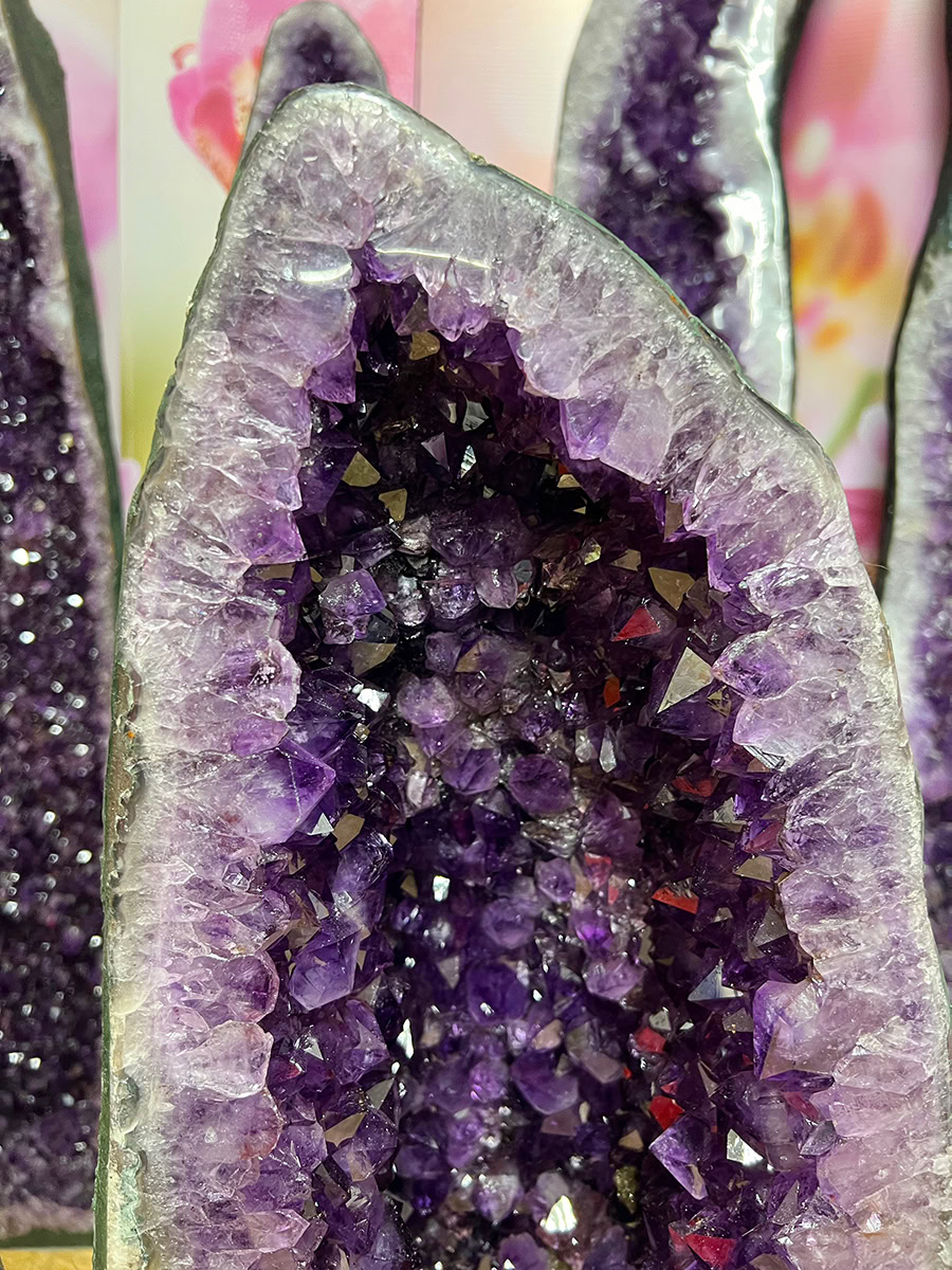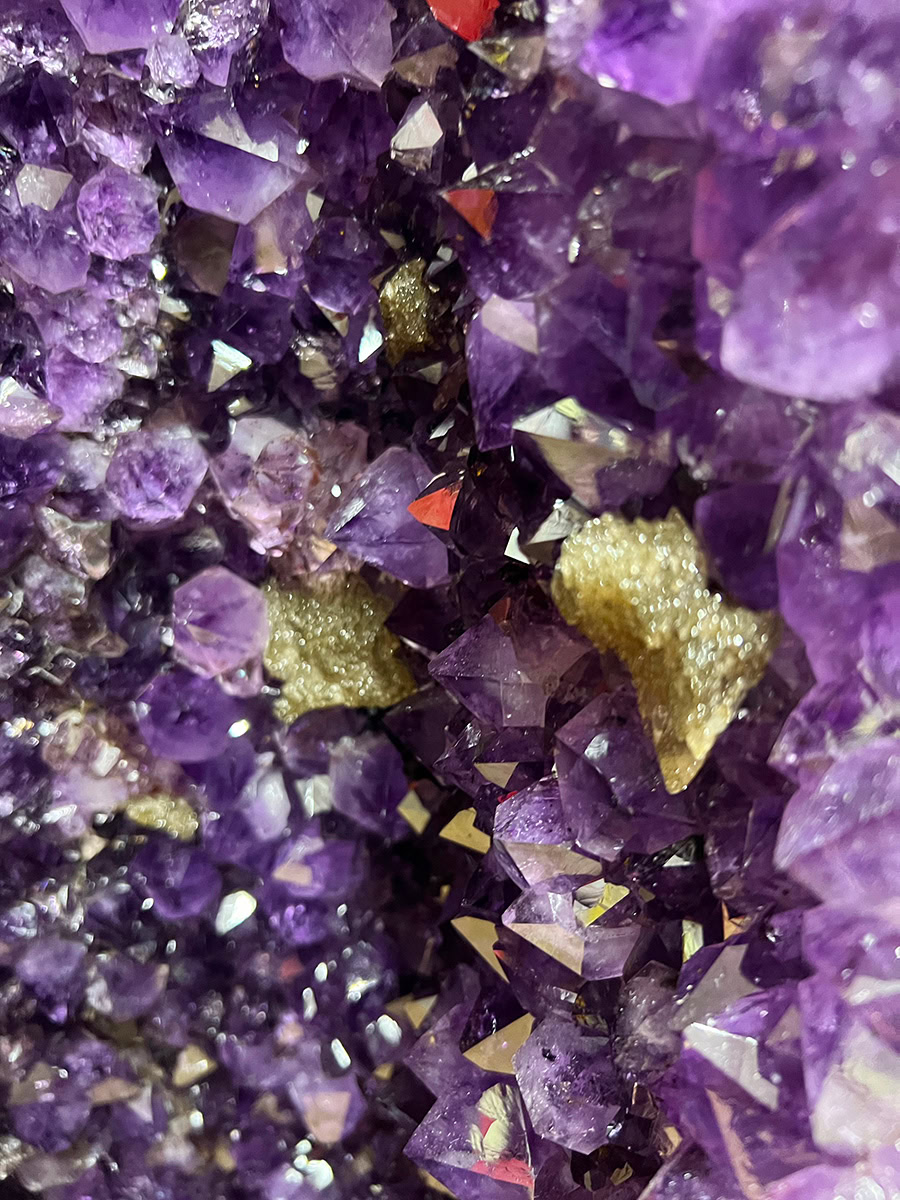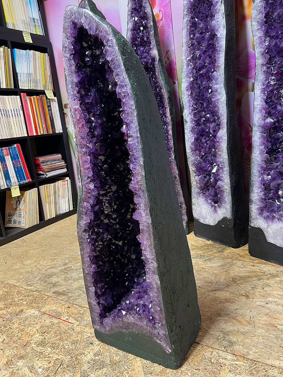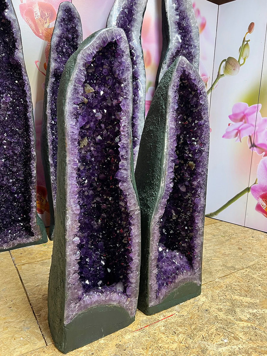 Twee geodes die bij elkaar horen met prachtig gevormde kristallen en mooi diep paars van kleur.