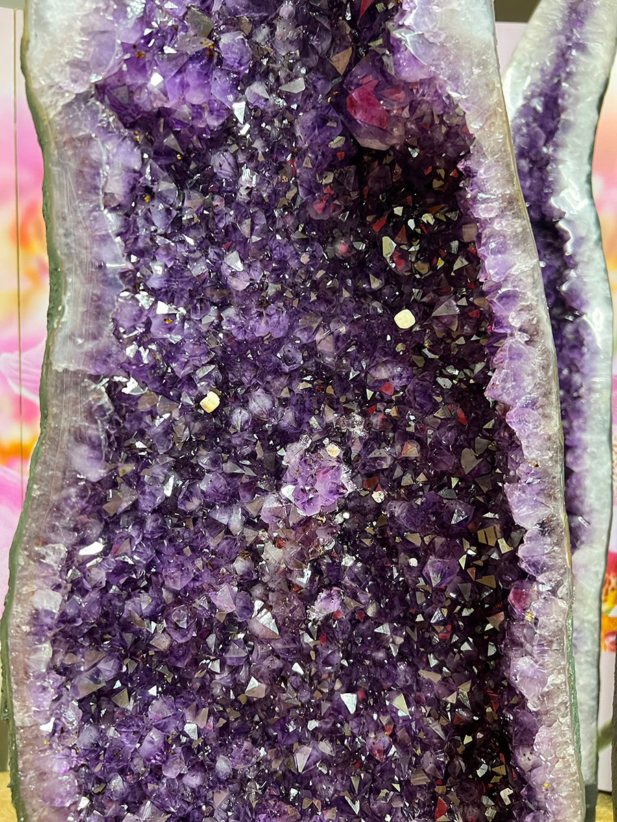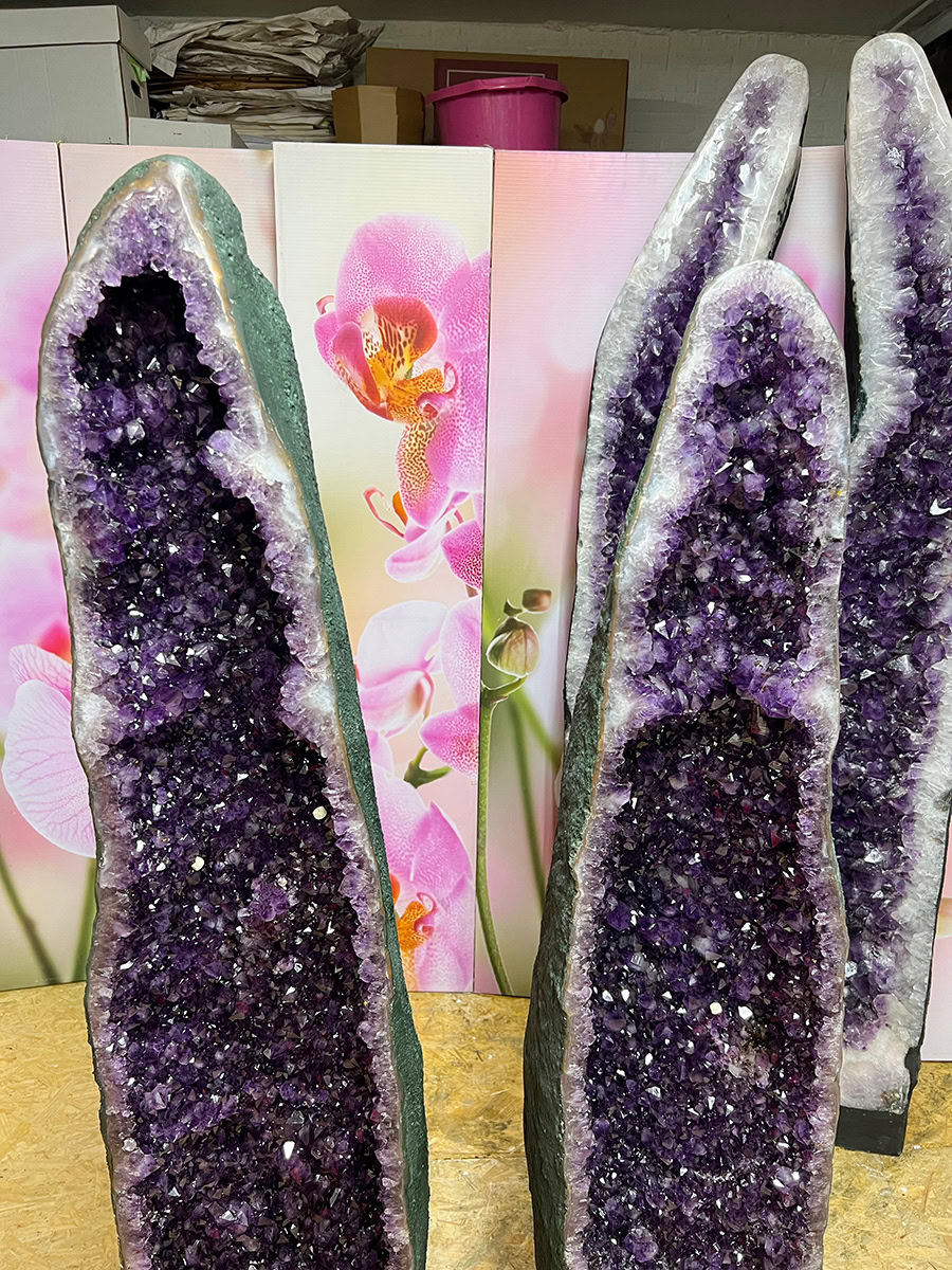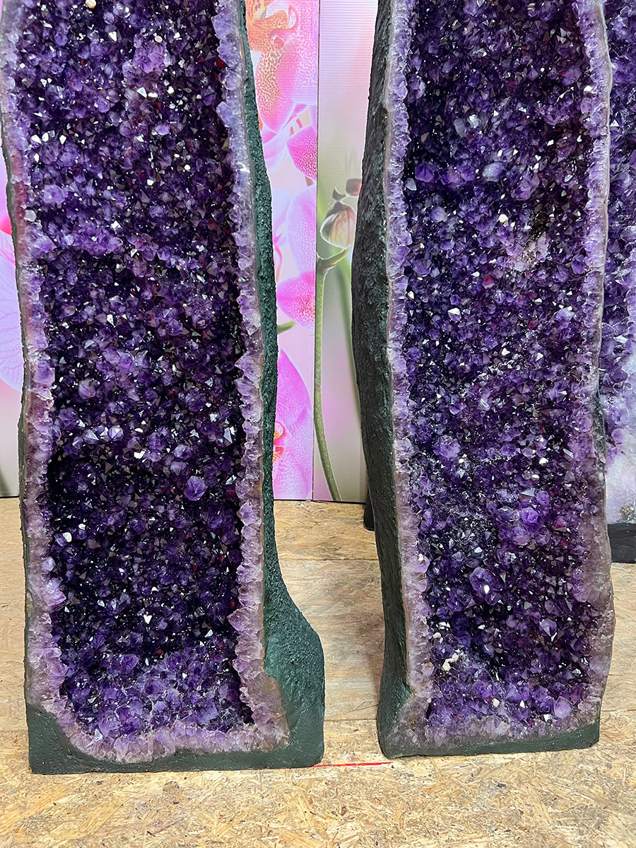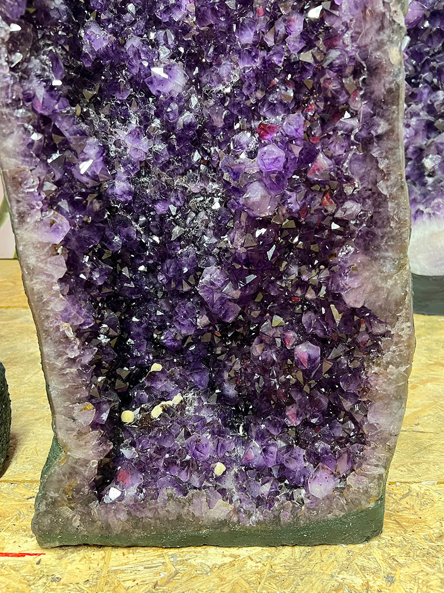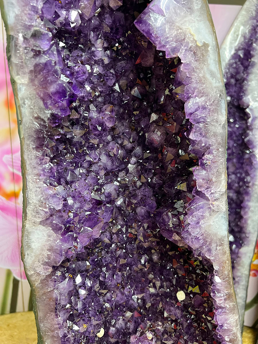 Twee geodes die bij elkaar horen met prachtig gevormde kristallen en mooi diep paars van kleur.
