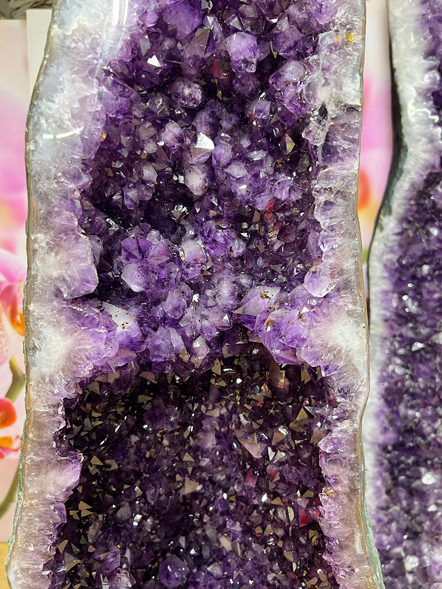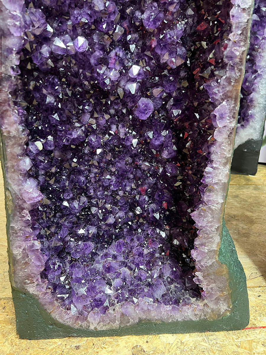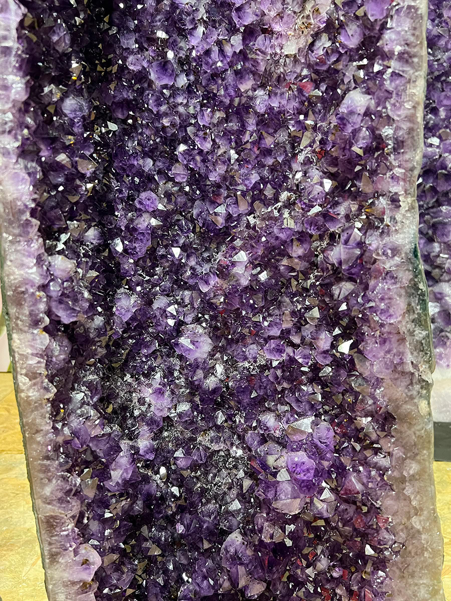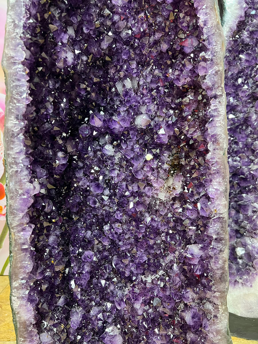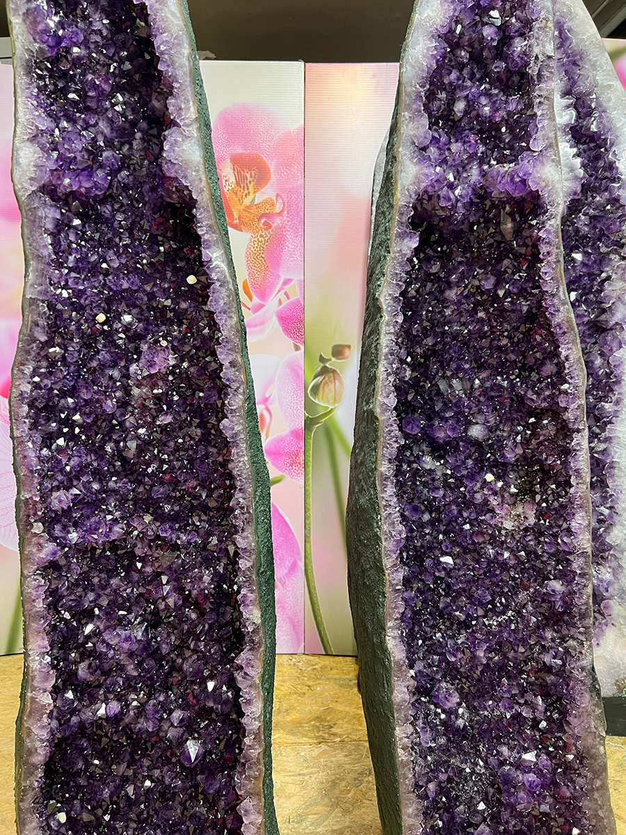 Twee geodes die bij elkaar horen met prachtig gevormde kristallen en mooi diep paars van kleur.