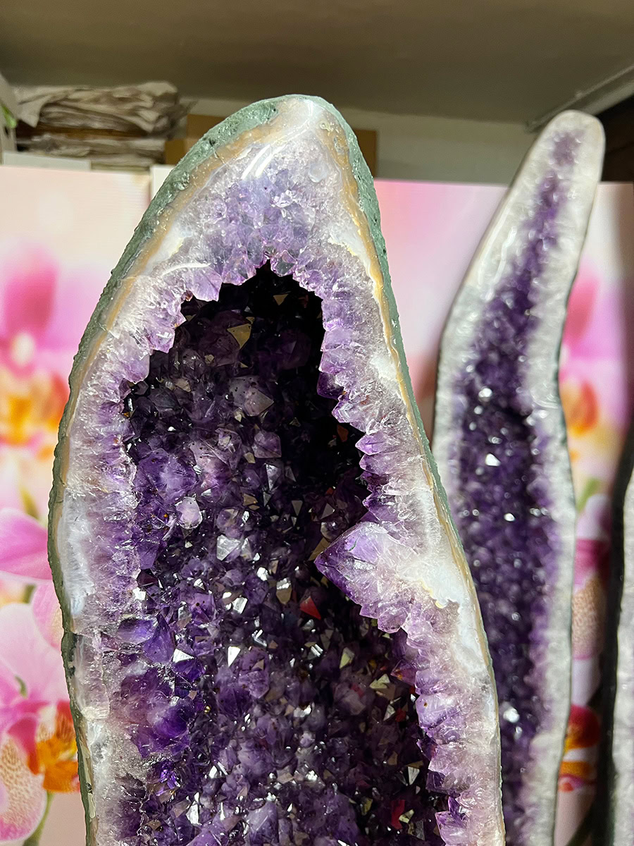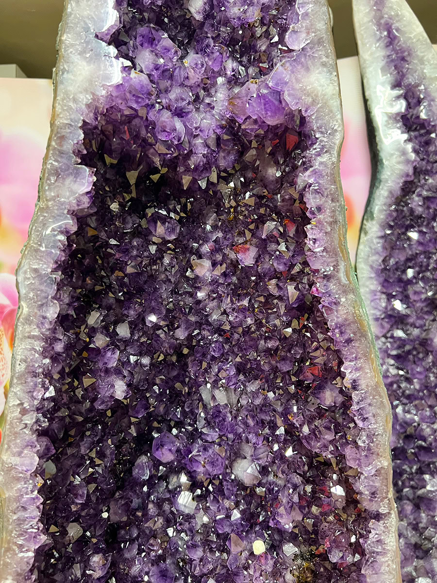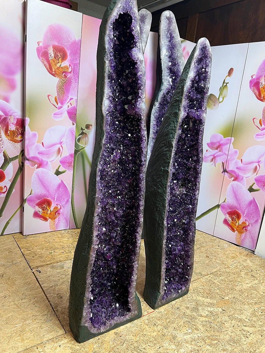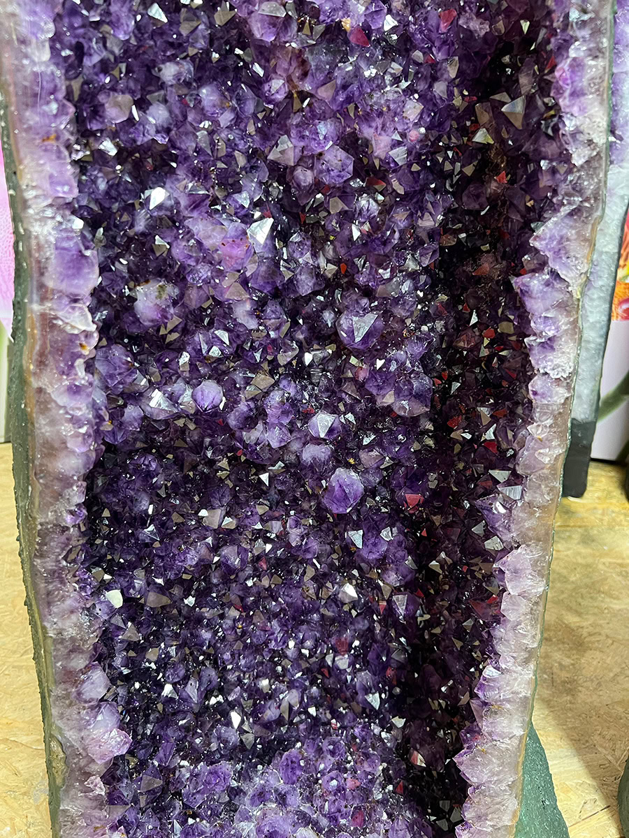 Twee geodes die bij elkaar horen met prachtig gevormde kristallen en mooi diep paars van kleur.