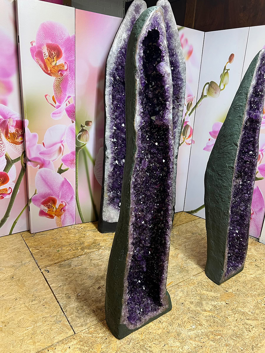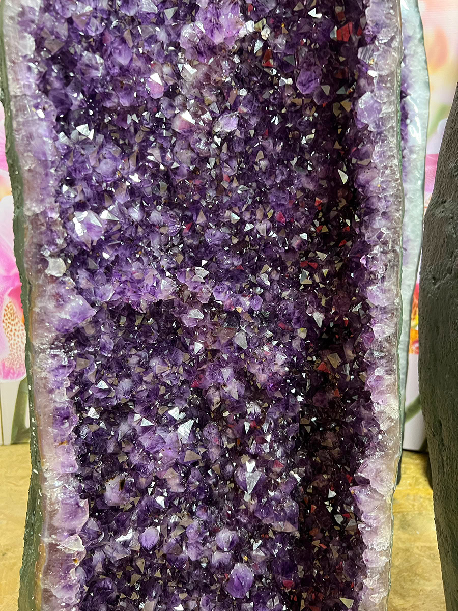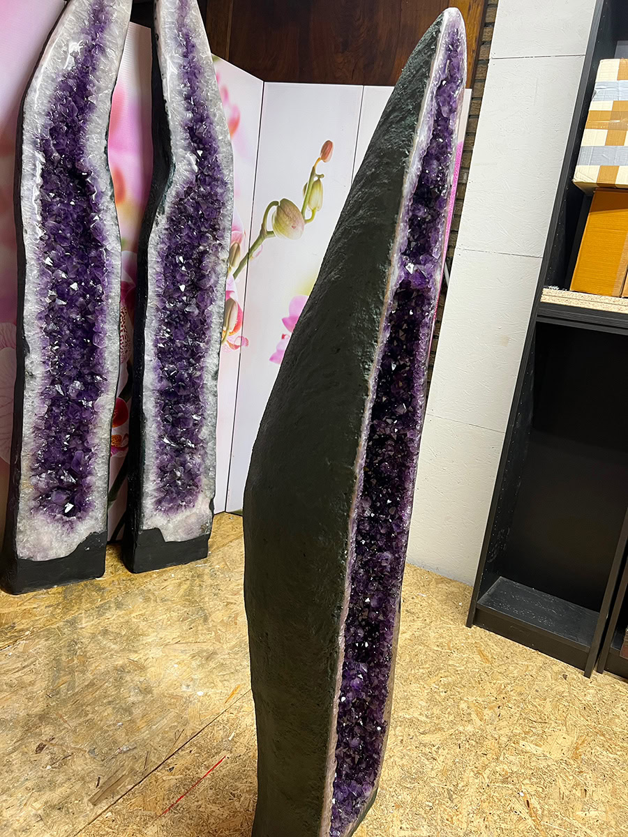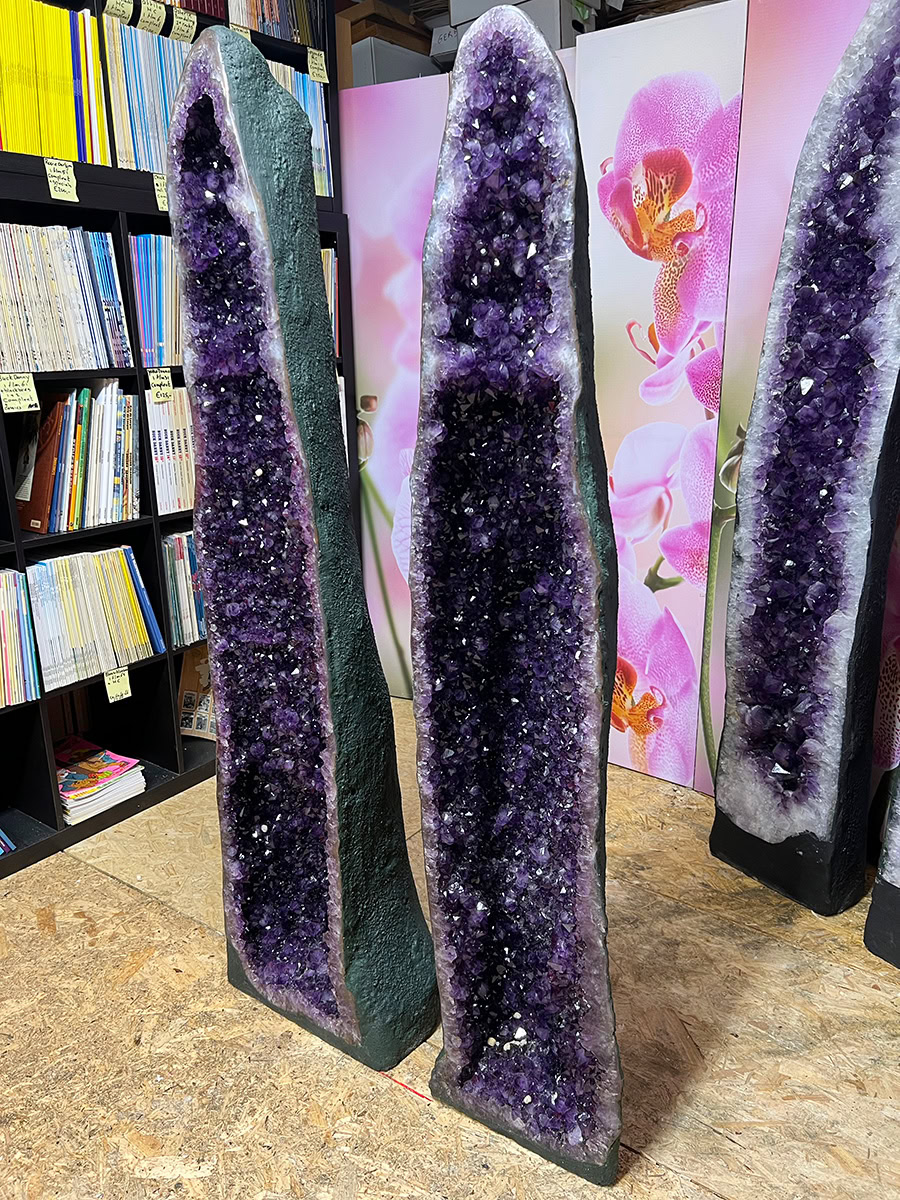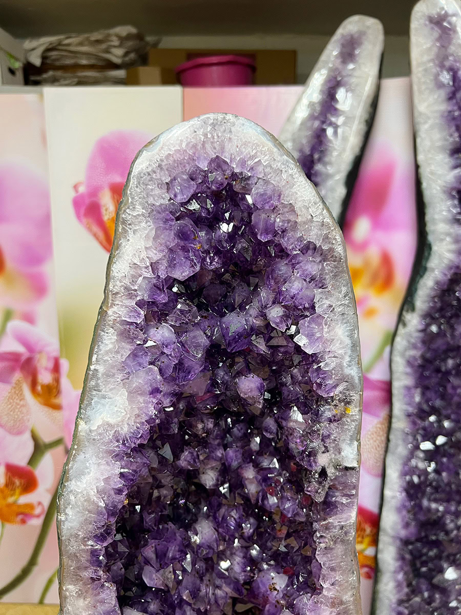 Twee geodes die bij elkaar horen met prachtig gevormde kristallen en mooi diep paars van kleur.