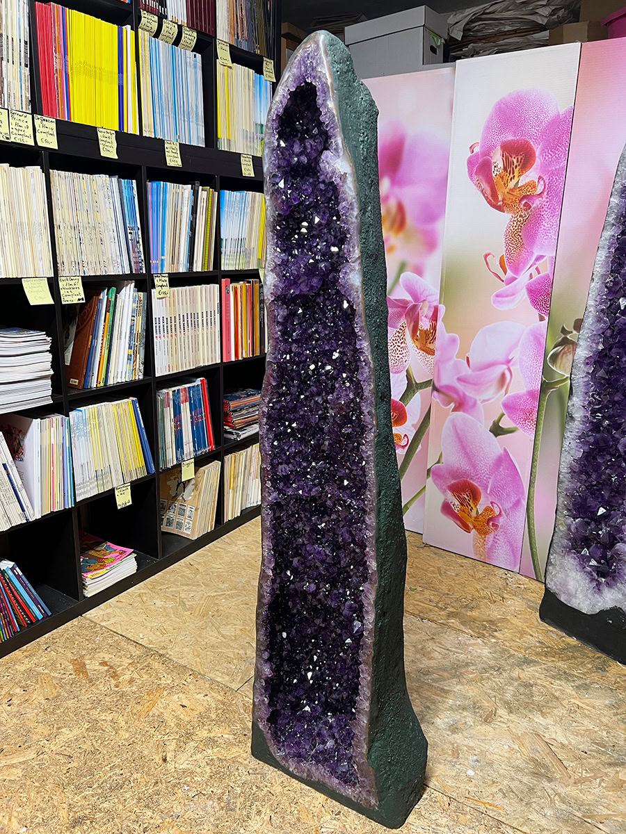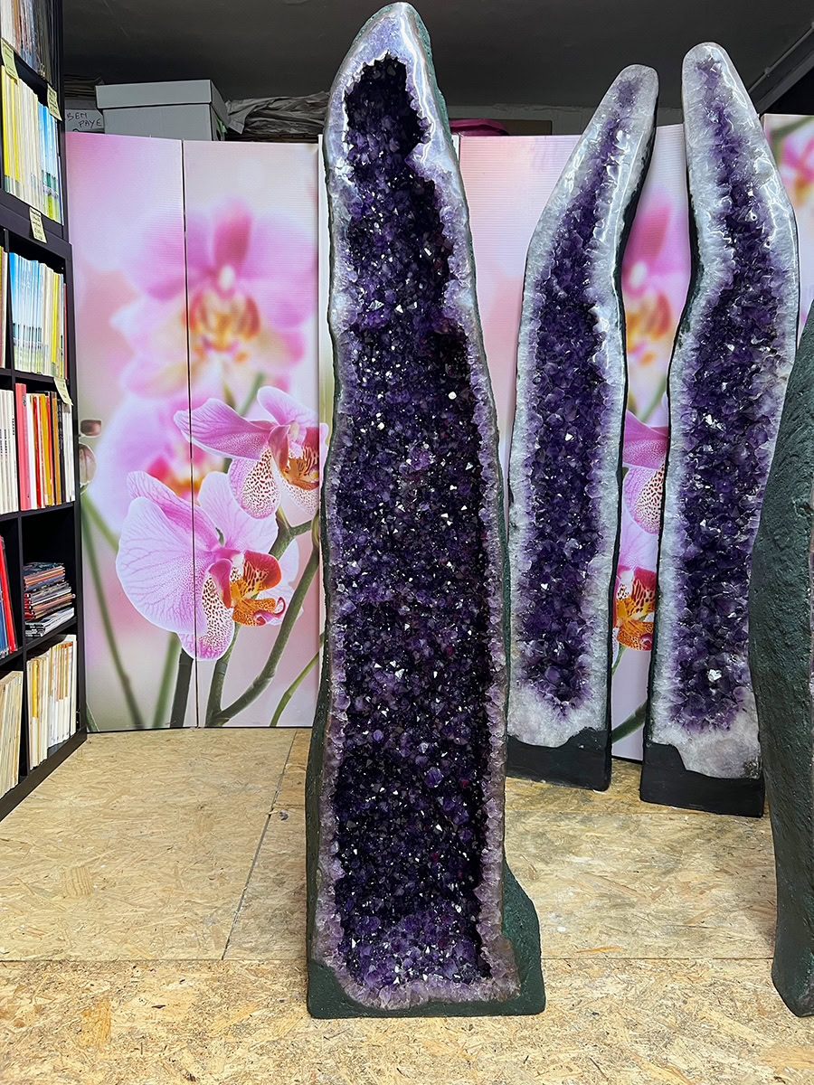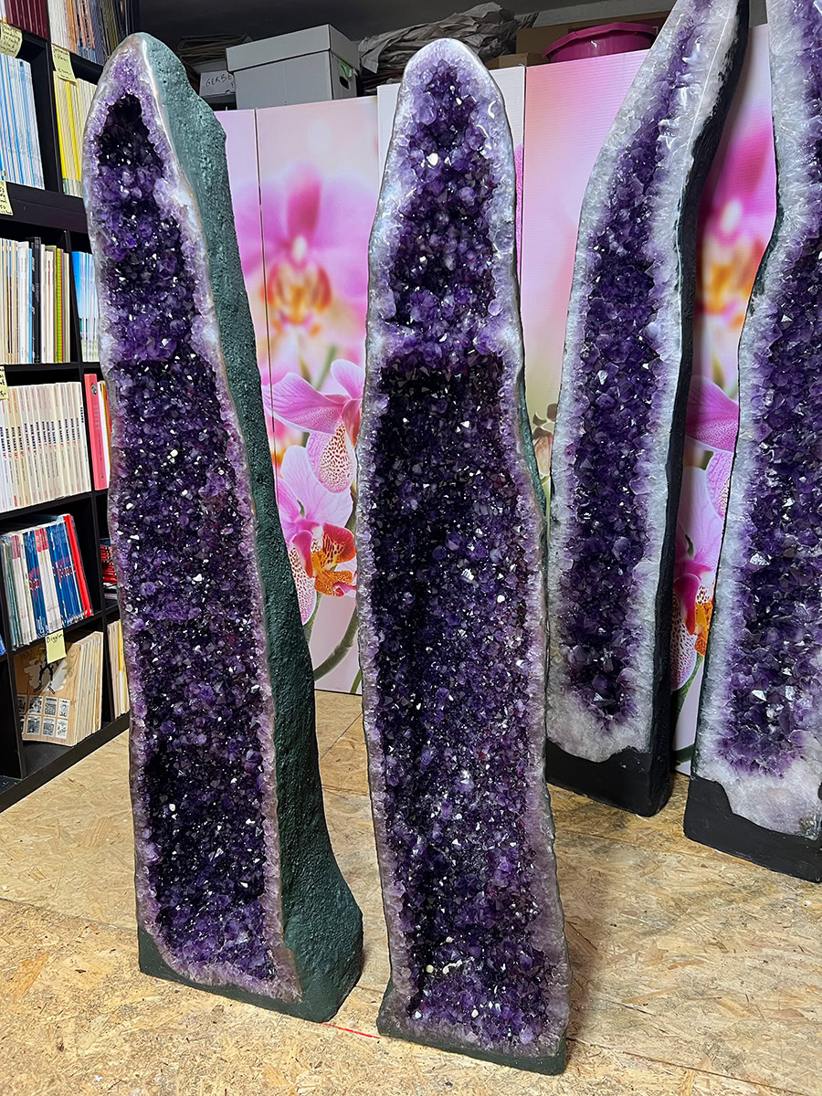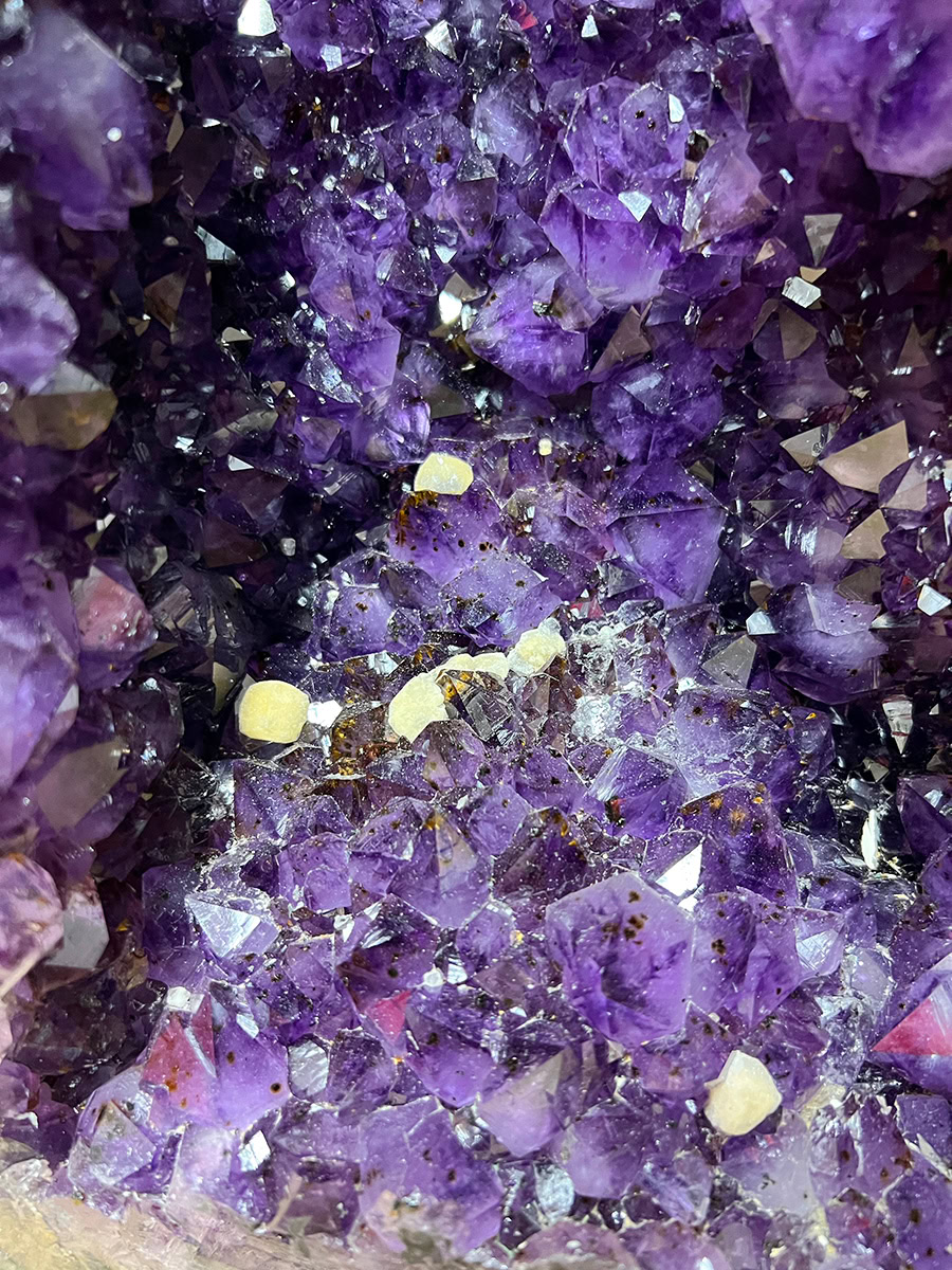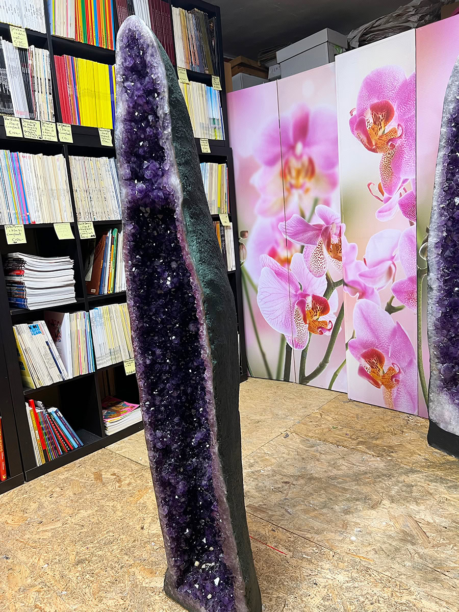 Twee geodes die bij elkaar horen met prachtig gevormde kristallen en mooi diep paars van kleur.