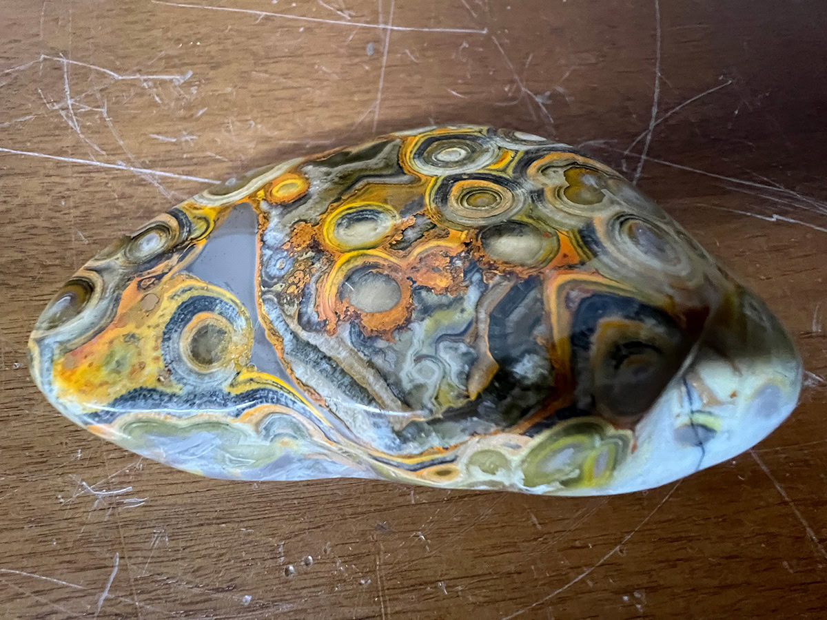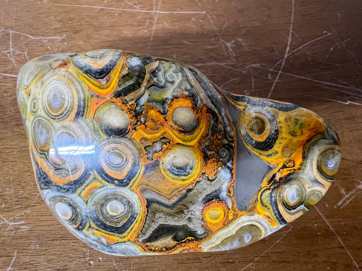Bumblebee Eyes Jaspis is een wat zeldzamere steen en bestaat uit vulkanisch gesteente, hematiet en zwavel. Het zwavelgehalte in de steen zorgt voor de typisch gele kleur. Arseensulfide zorgt voor de oranje kleur en Mangaandioxide geeft de kenmerkende zwarte elementen.