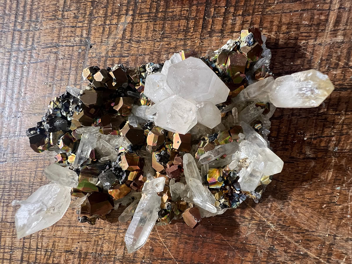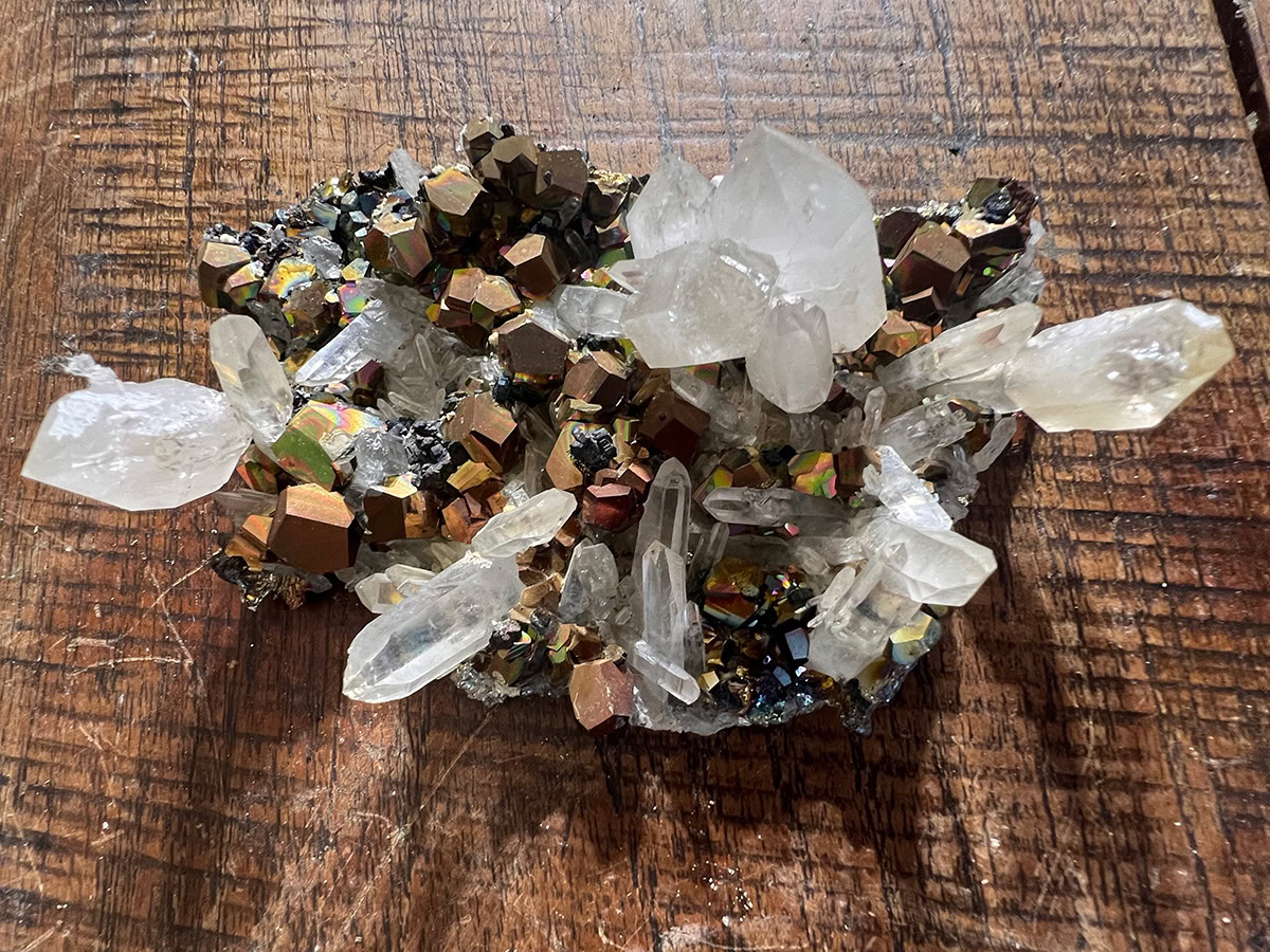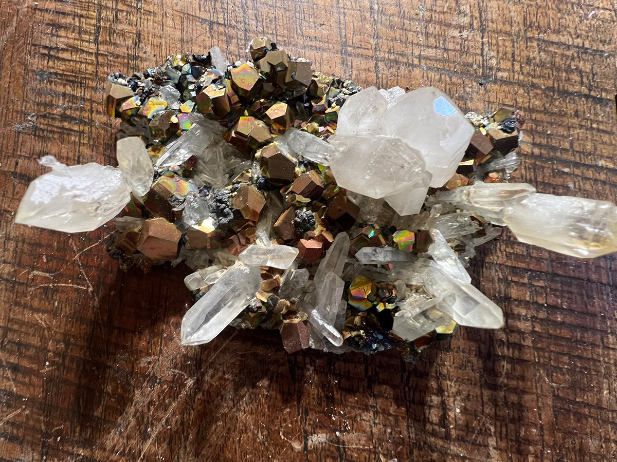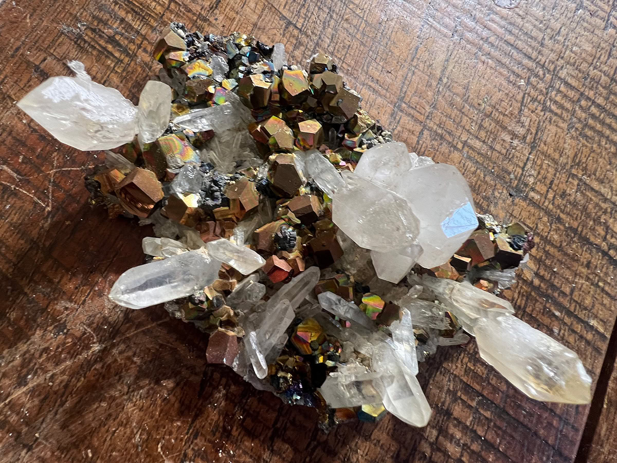 Regenboog Pyriet, ook bekend als iriserend pyriet of pauwpyriet, heeft een kleurrijke irisatie, die het resultaat is van dunne lagen ijzeroxiden of andere secundaire pyriet.