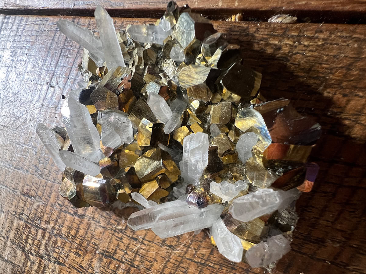 Regenboog Pyriet, ook bekend als iriserend pyriet of pauwpyriet, heeft een kleurrijke irisatie, die het resultaat is van dunne lagen ijzeroxiden of andere secundaire pyriet.