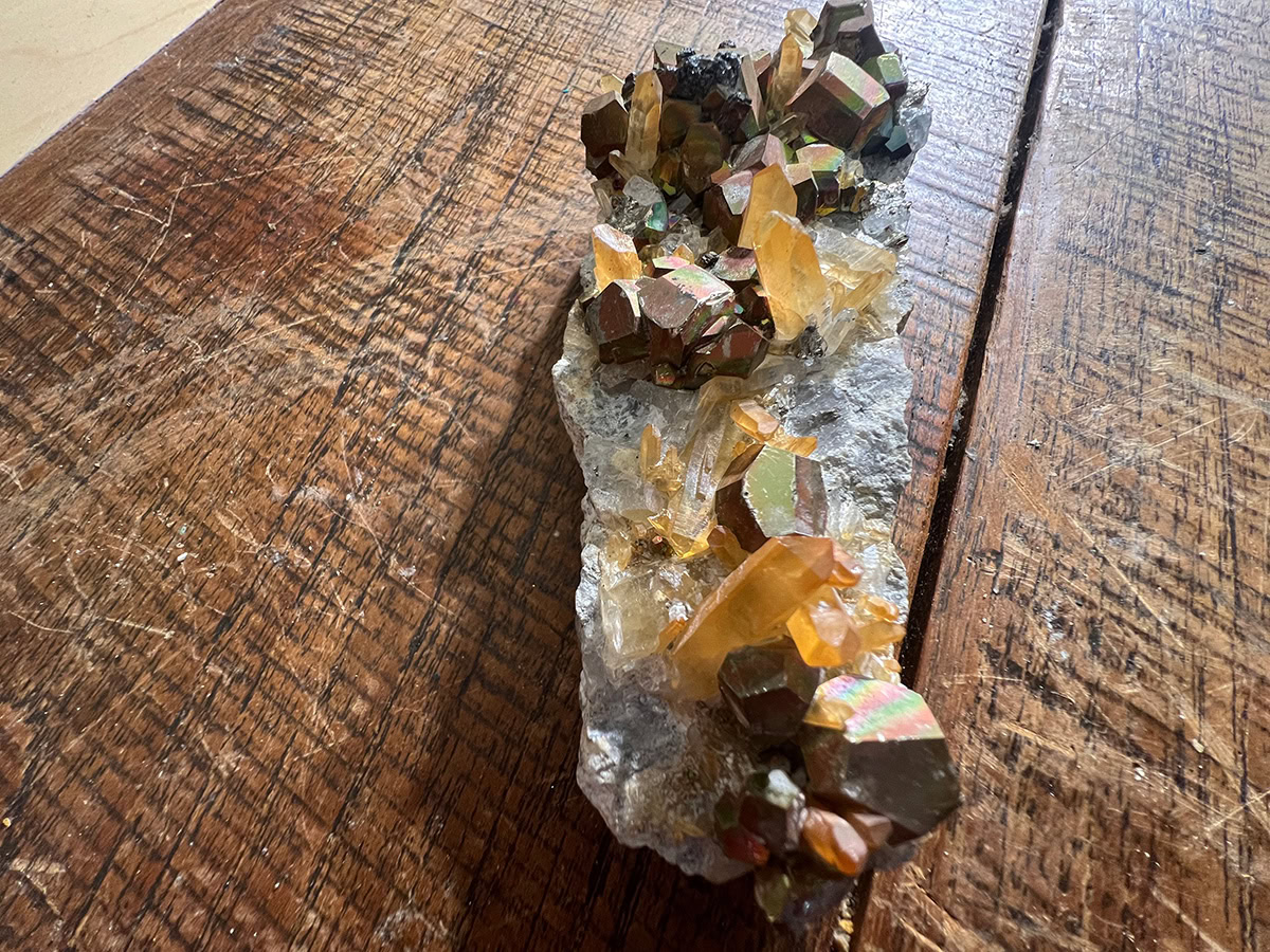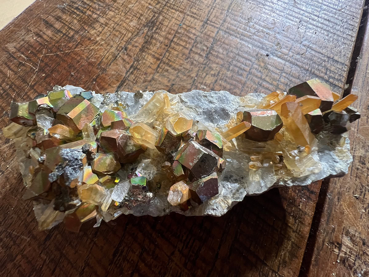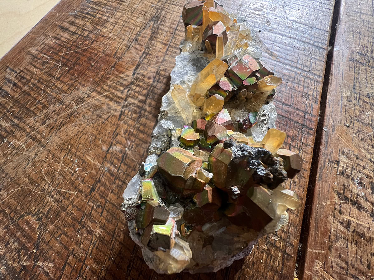 Regenboog Pyriet, ook bekend als iriserend pyriet of pauwpyriet, heeft een kleurrijke irisatie, die het resultaat is van dunne lagen ijzeroxiden of andere secundaire pyriet.