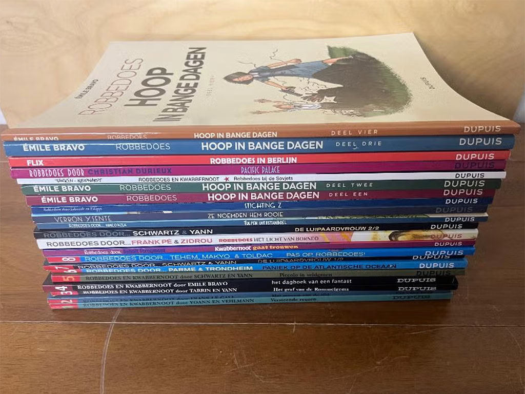 Robbedoes serie 1 t/m 56 en 1 t/m 23 (alleen het laatste nummer kost al 100 euro), plus de buitenreeks delen 1 en 2 en de specials 1 en 2: kortom het bijna complete werk.